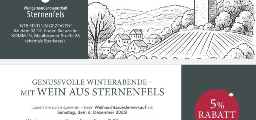 Am Samstag, dem 6. Dezember 25 findet unser Weihnachts-Sonderverkauf statt. Als kleines Dankeschön erhalten Sie 5% auf unser gesamtes Sortiment. Bitte beachten Sie, daß wir umgezogen sind. Ab dem 6.12. finden Sie uns im KOMM-IN, Maulbronner Straße 26 (ehemals Sparkasse). Wir freuen uns auf Ihren Besuch….