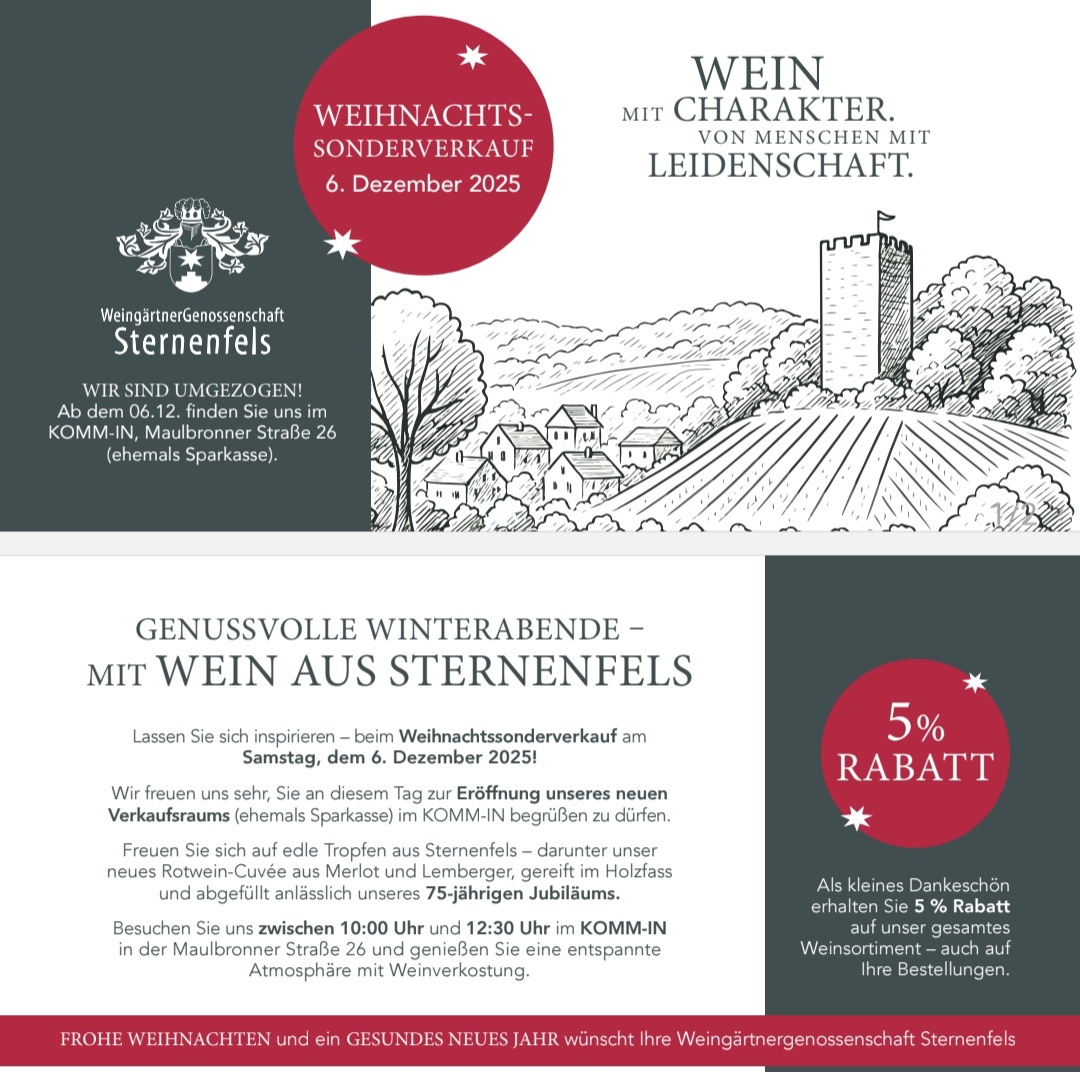 Am Samstag, dem 6. Dezember 25 findet unser Weihnachts-Sonderverkauf statt. Als kleines Dankeschön erhalten Sie 5% auf unser gesamtes Sortiment. Bitte beachten Sie, daß wir umgezogen sind. Ab dem 6.12. finden Sie uns im KOMM-IN, Maulbronner Straße 26 (ehemals Sparkasse). Wir freuen uns auf Ihren Besuch….